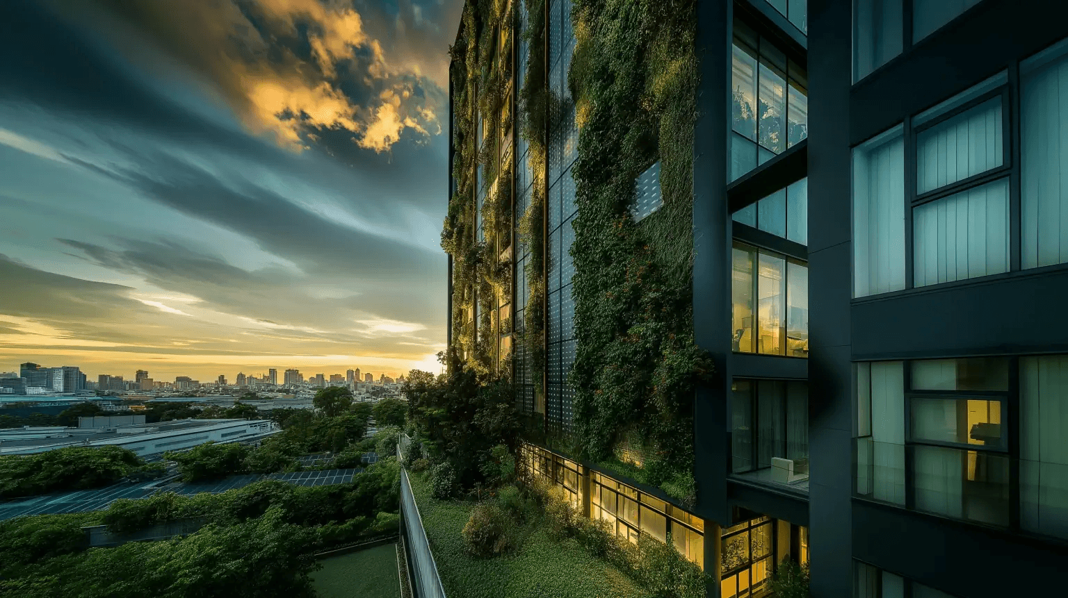 Modern sustainable building with green spaces